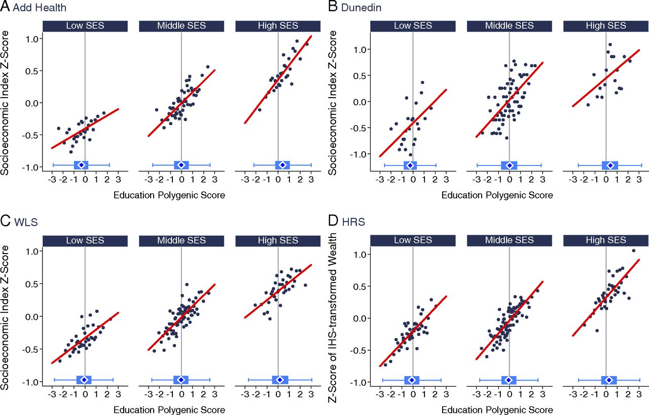 The figure below shows SNP-based polygenic score and life outcome (socioeconomic index, on vertical axis) in four longitudinal cohorts, one from New Zealand (Dunedin) and three from the US. Each cohort (varying somewhat in size) has thousands of individuals, ~20k in total (all of European ancestry). The points displayed are averages over bins containing 10-50 individuals. For each cohort, the individuals have been grouped by childhood (family) social economic status. Social mobility can be predicted from polygenic score. Note that higher SES families tend to have higher polygenic scores on average -- which is what one might expect from a society that is at least somewhat meritocratic. The cohorts have not been used in training -- this is true out-of-sample validation. Furthermore, the four cohorts represent different geographic regions (even, different continents) and individuals born in different decades.
